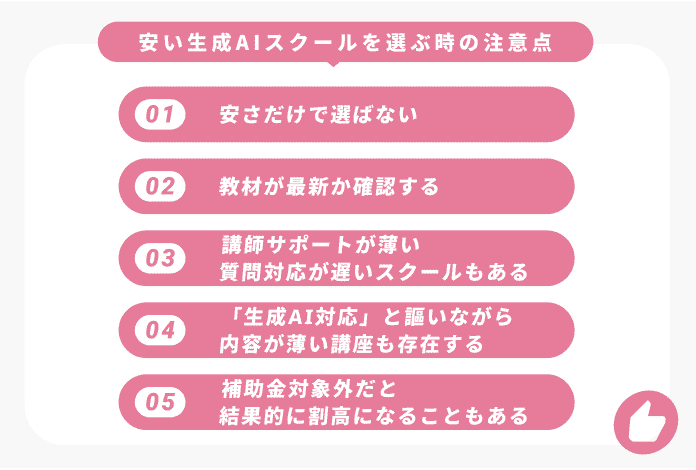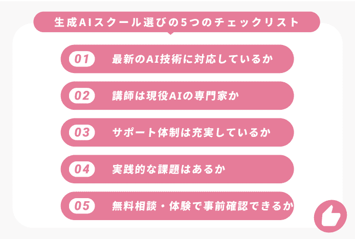 生成AIスクール選びで後悔しないためには、申し込む前に確認すべき5つのポイントがあります。
