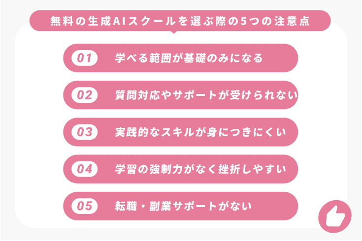 ここでは、無料の生成AIスクールを選ぶ際に知っておくべき5つの注意点を解説します。
