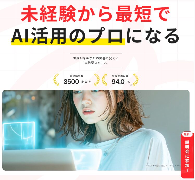 生成AIの基本操作から実務応用まで段階的に学べ、文章生成や画像生成などのAIツールを実際に使いながらスキルを習得できます。