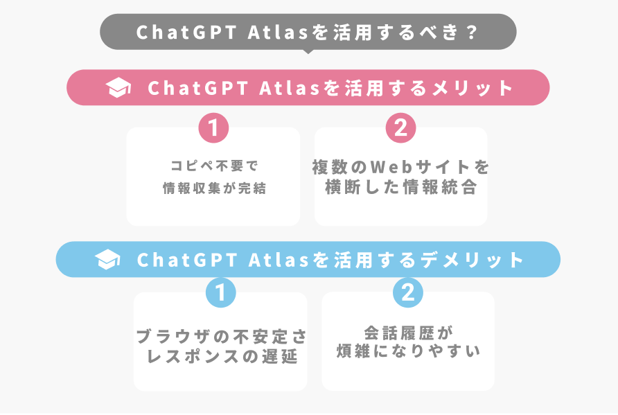 特にリサーチや資料作成の場面では、Atlasを使うことでコピペ作業をほぼゼロにできる点が大きな強みです。