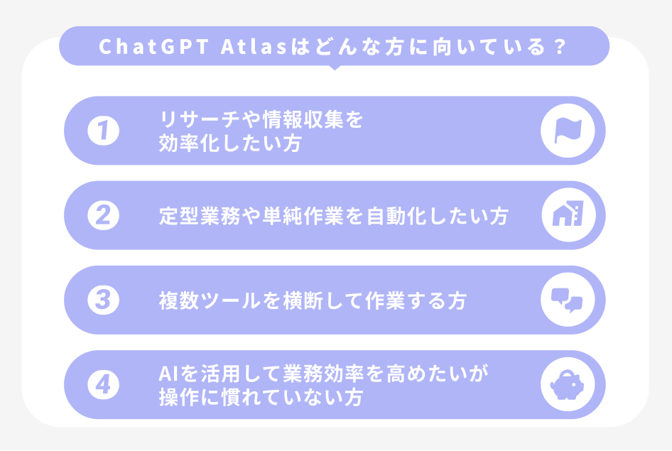 ChatGPT Atlasは、単なる情報検索ツールではなくAIが自動で情報収集・整理・連携まで行うプラットフォームです。
