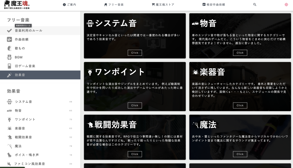 魔王魂が提供する効果音ライブラリは、様々な効果音を無料で利用できる便利なサービスです。